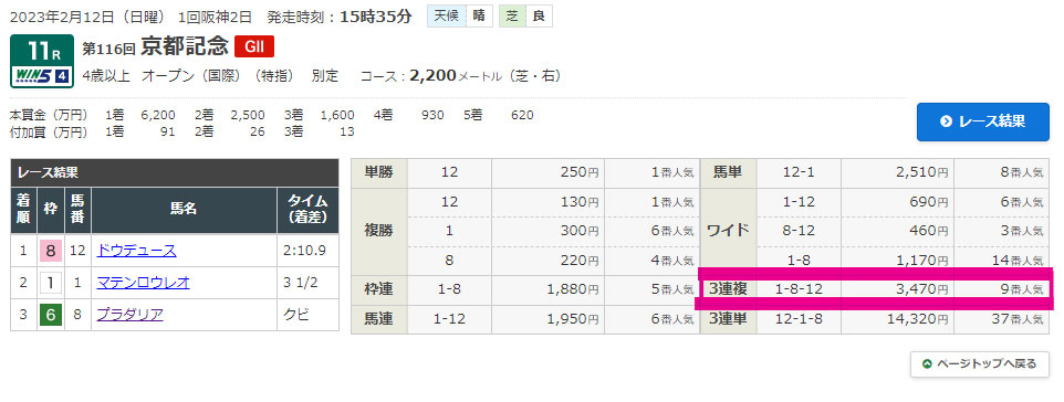 2/12(日)に阪神11Rで開催されたG2・京都記念の無料情報になります。