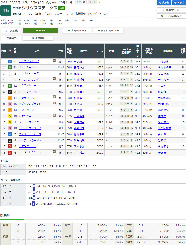 ダノンスマッシュが負けてしまったのは意外でしたがピクシーナイト、レシステンシアと人気どころがワンツーフィニッシュ、そして大穴を空けたのがレシステンシアにアタマ差まで追い込んだシヴァージだ。