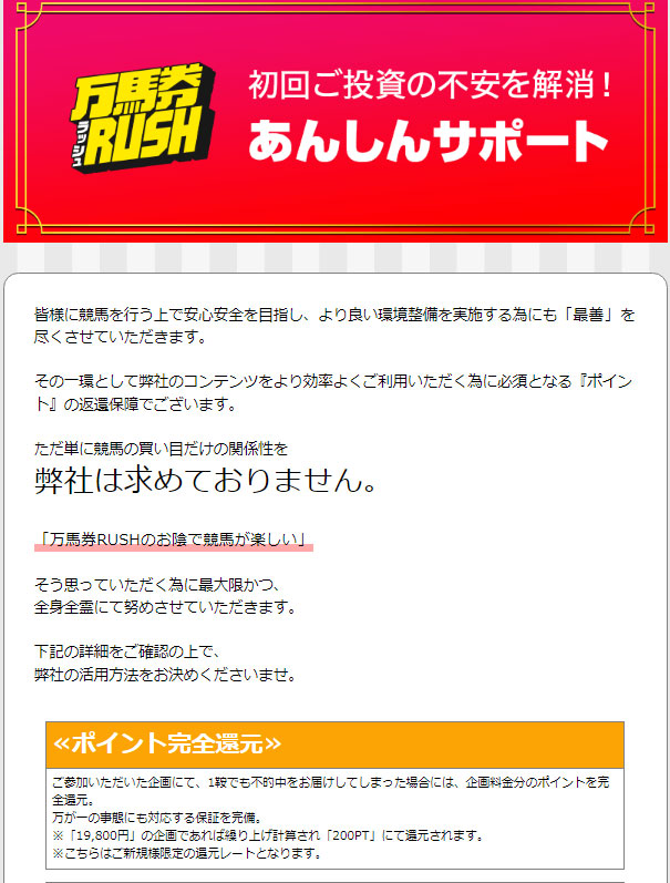 また、このように「あんしんサポート」の記載のあるように不的中の予想をお届けした場合、ポイントにて還元してくれるようで有料情報にも参加しやすいサイトとなっています。