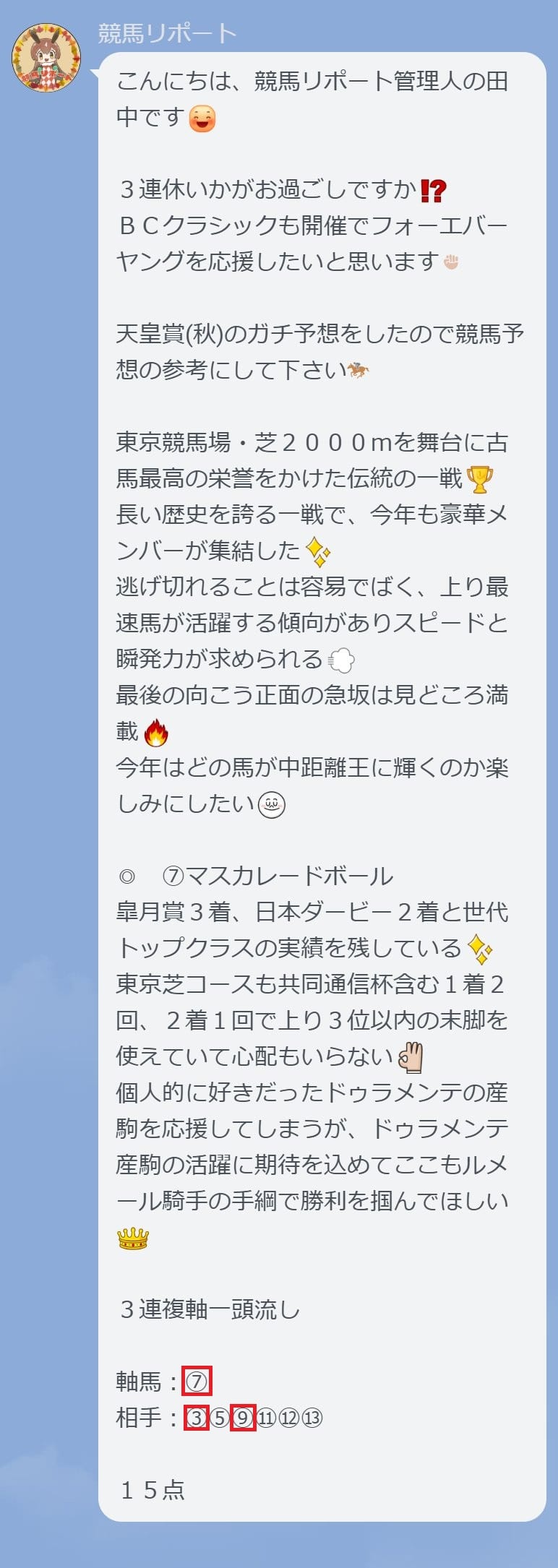 実績馬が集う天皇賞という事もあり配当は先週の菊花賞以上という事はできませんでしたがしっかりと的中をお届けできました。