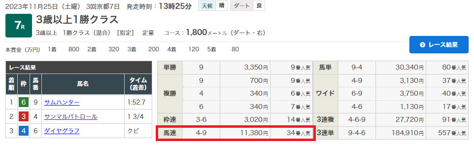 馬連34番人気で113.8倍的中で払い戻し金額『11万3800円』GET!