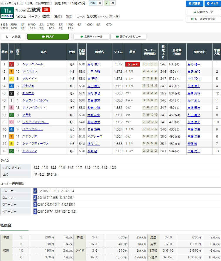 結果は③ジャックドールが見事に逃げ切り、2着にも実績馬⑩レイパパレ。
