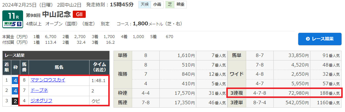 1番人気から流したワイドと3連複でそれぞれ残念な結果に終わってしまいました。
