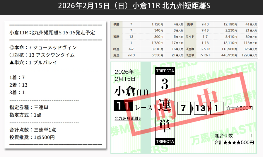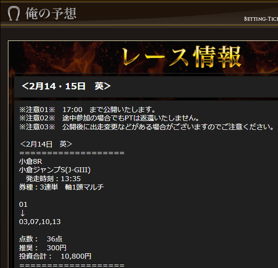 万馬券マスターズのサイト内にあったのスクショしてきたんだけど小倉メインでえぐすぎる的中させてる。 18頭立てのブービー人気を3着固定、3連単10万馬券を1点的中とかどんだけすげーのよこの予想。