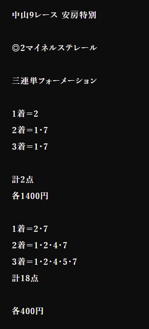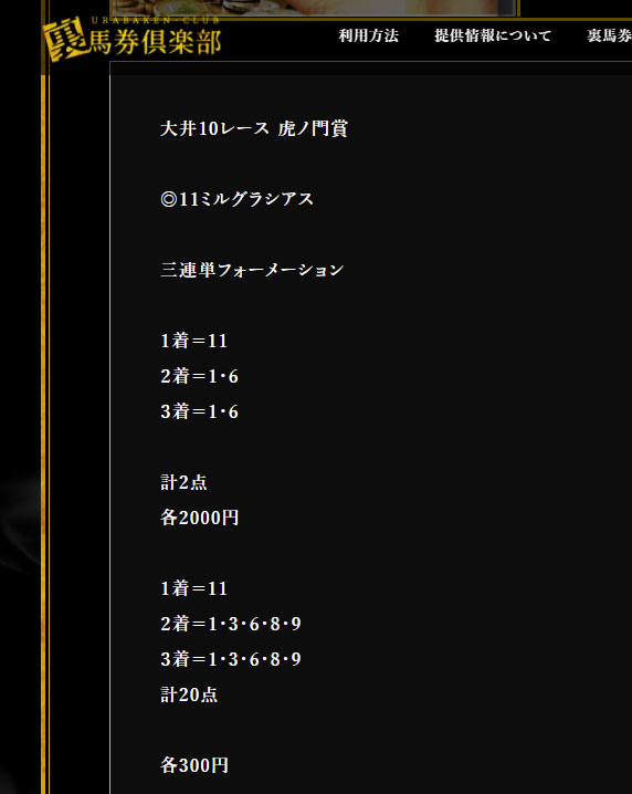 3連単3千円決着だったけどはずれました。 だめですね~裏馬券倶楽部は・・・