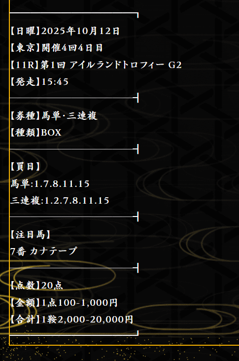 2馬券種無料予想的中! 馬単→4万4400円 3連複→3万4200円 合計7万8600円払い戻しでした! ここからは有料情報になりますが、【穴熊情報】も的中 東京11Rアルゼンチン共和国杯50万7350円払い戻しでした! 平場も重賞も当たりまくりな1日でした!