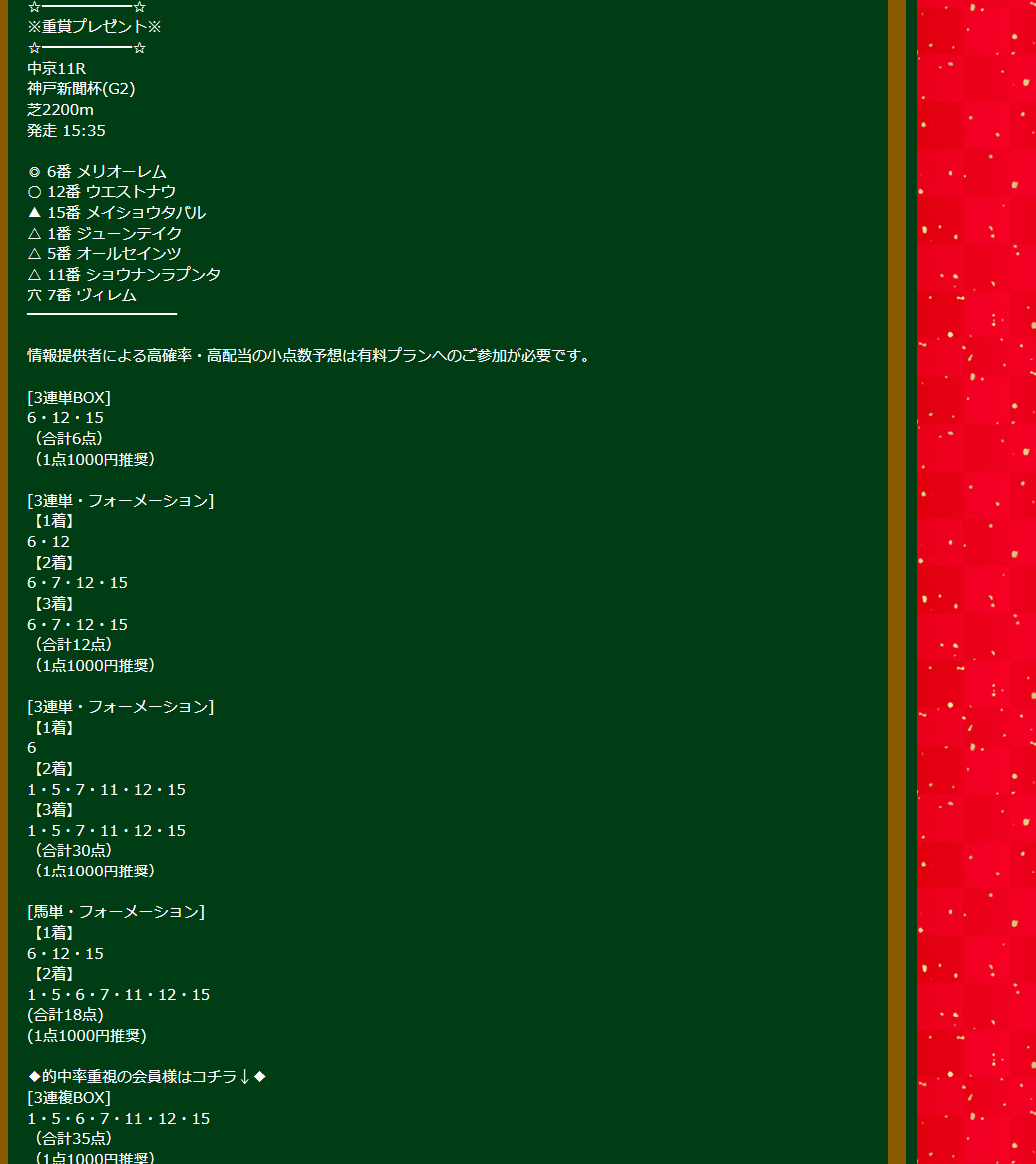 無料情報だから割り切った気持ちでやってたけど馬単48.7番+3連複60倍、合計すると万馬券級の払い戻しで10万8700円獲得できました!