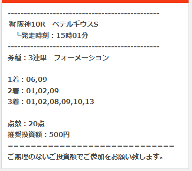 管理人さんが試されていたスタートダッシュプラン使ってみました。 推定配当30~50万でどんな結果になるか楽しみな週でした、結果は 3発3的中で38万1250円払戻し。 情報参加費用9,800円。 3鞍馬券代29,000円。 回収率→982% 情報料+馬券代を差し引いても→+34万2450円収支。 画像が1枚しか張れなかったので重賞の買い目だけを貼っておきます。 12/6土曜日 阪神10R妙見山ステークス/130,950円 12/7日曜日 阪神11Rりんくうステークス/119,350円 G1チャンピオンズカップ/130,950円